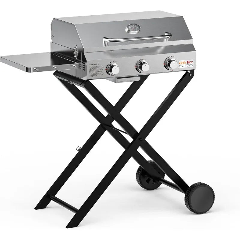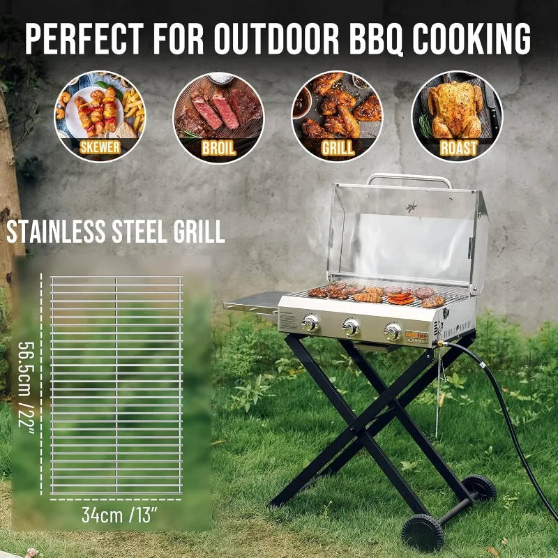 VERSATILE 3 BURNERS GAS GRILL: The stainless steel BBQ gas grill with 3 burners gives you the capacity of a large grill in a portable size. You can grill any food from fresh vegetables to meats, seafood and more anytime anywhere.