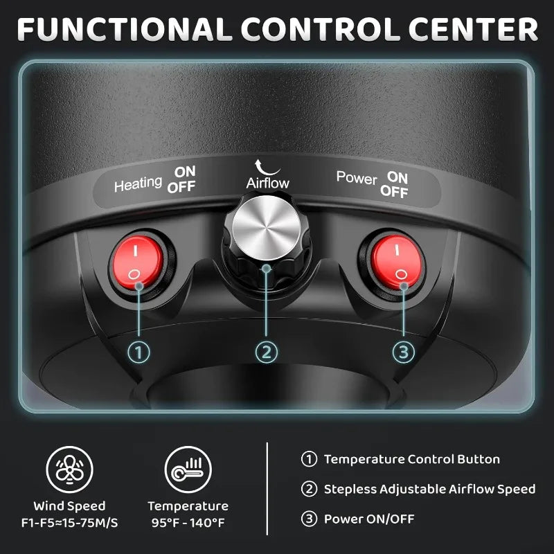 Adjustable Speed & Temperature: Strong and stable motor equips this dog blow dryer with several speed and temperature levels. Maximum Wind Speed: 72m/s; Temperature Range: 95℉-135℉. The dryer will stop working immediately if the temperature is too high because it has a built-in temperature control protection system.