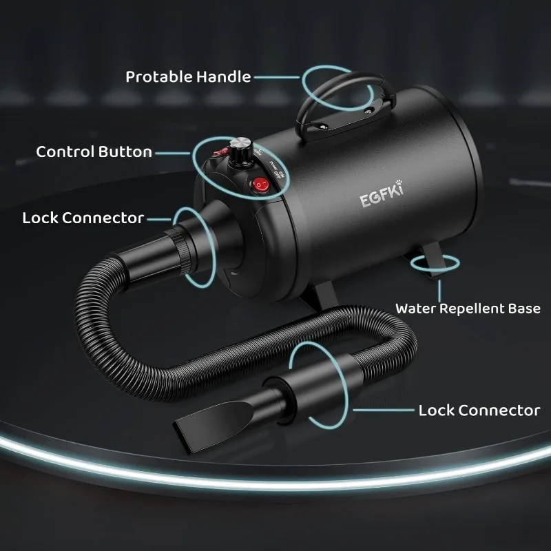 Strong Blow Force: The power of this dog hair dryer is 5.2 HP/3800 watts. The strong blow force enables the dog hair dryer to dry the thick dog hair, remove loose dog hair, dirt,and scurf, making the dog hair more smooth and shiny to achieve the beauty effect of pet grooming shop.